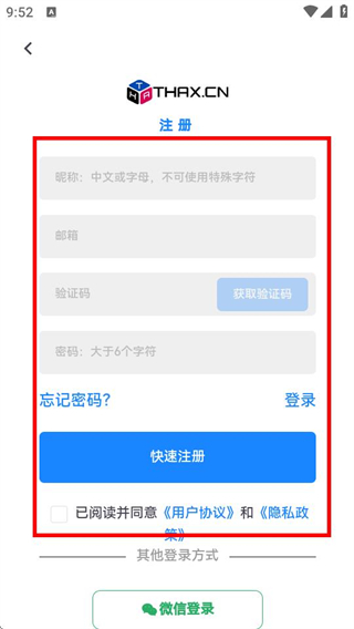 4、在注册页面,填写信息,勾选协议后点击快速注册,完成账号注册。