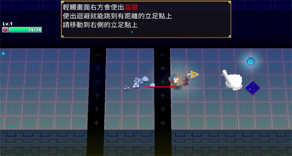 2、轻触画面方侧使出回避,借助回避跳到有距离的立足点上,完成移动任务。