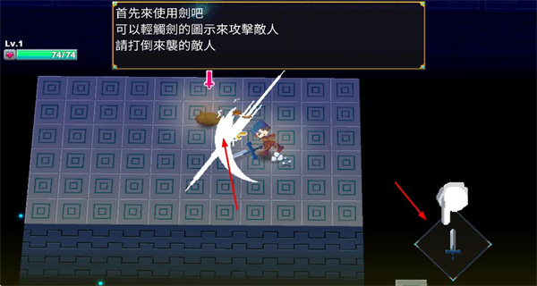 3、使用剑攻击,轻触剑的图示攻打敌人,打倒来袭的敌人,提升近战能力。