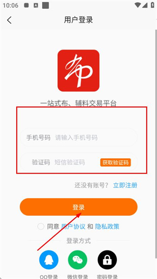 3、在用户登录页面输入手机号码、验证码,勾选协议后,点击登录完成账号登录操作。