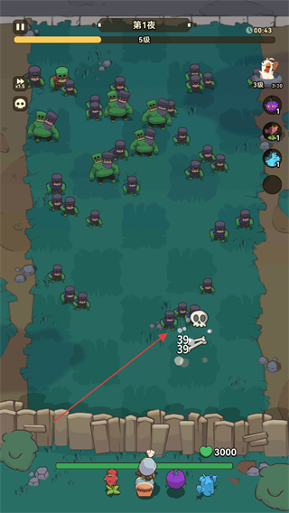 4、持续战斗升级至5级,清理僵尸后获得骷髅道具,积累资源提升战力。