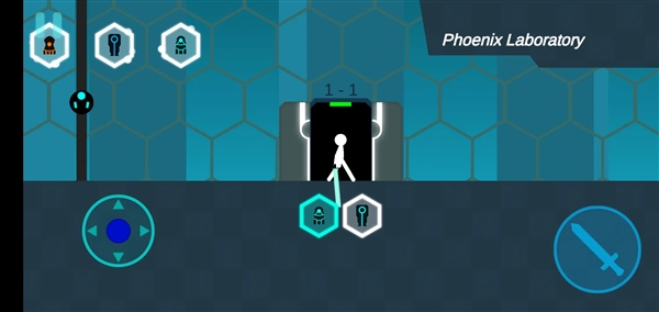 1、使用左侧虚拟摇杆操控火柴人移动,从初始区域出发,探索关卡。