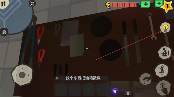 2、当任务要求找个东西把油箱戳穿时,在工具区域寻找合适的工具如尖锐物品,用于戳穿油箱。