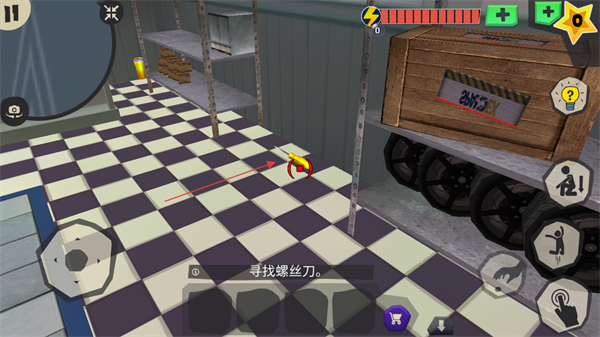 3、按照寻找螺丝刀的提示,在场景如仓库的格子地板区域中找到螺丝刀,用于后续的解谜或破坏操作。