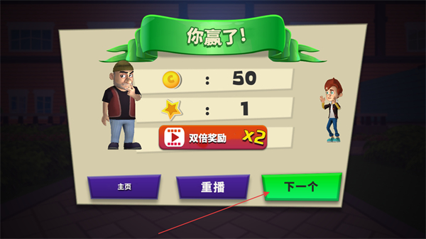4、完成关卡任务后,会出现“你赢了”的界面,获得金币、星星等奖励,点击下一个可进入下一关继续挑战。