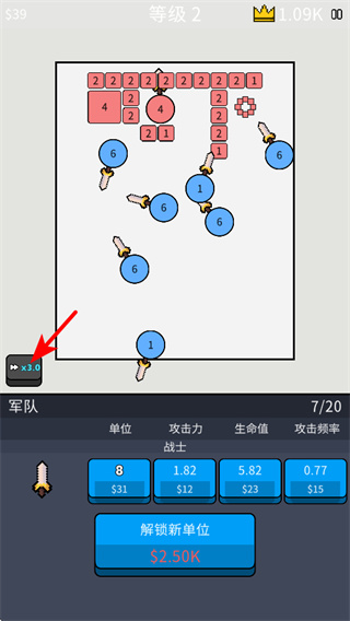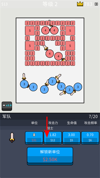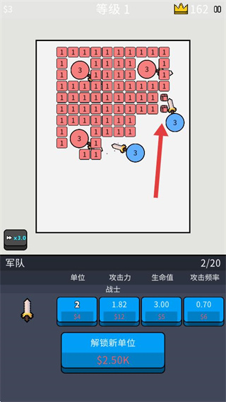 2、游戏中派遣单位如战士攻击数字区域,攻击时优先选择数字小的区域以快速推进,注意观察单位攻击力生命值搭配。