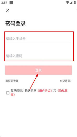 4、在登录页面填写手机号、密码,勾选协议后,点击登录完成账号登录操作。