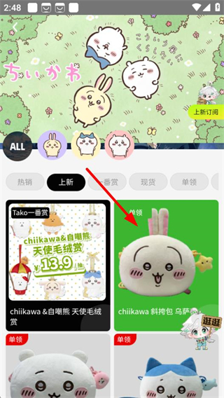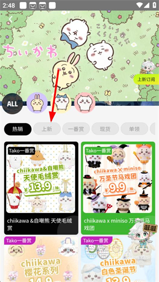 2、在chiikawa商品页面,点击上新标签,切换至上新商品列表。