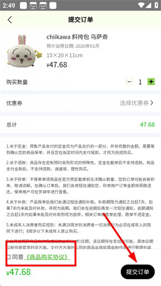 5、在提交订单页面,勾选协议后点击提交订单,完成商品购买操作。