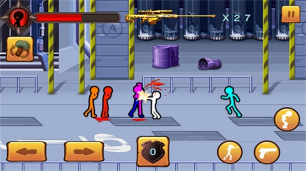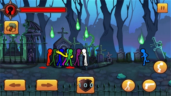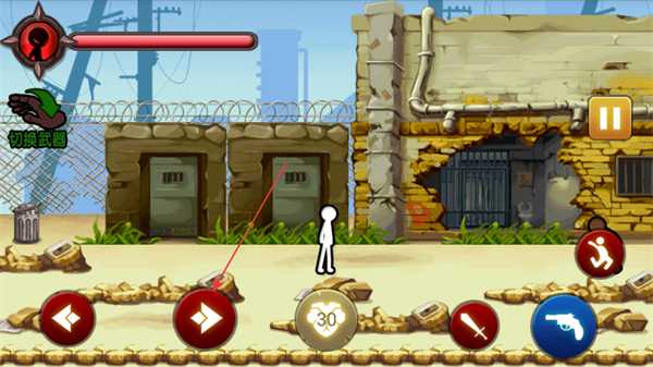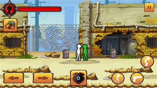 1、使用左下角的方向键左右箭头操控火柴人移动,在场景中探索,准备与敌人战斗。