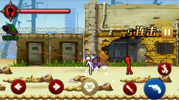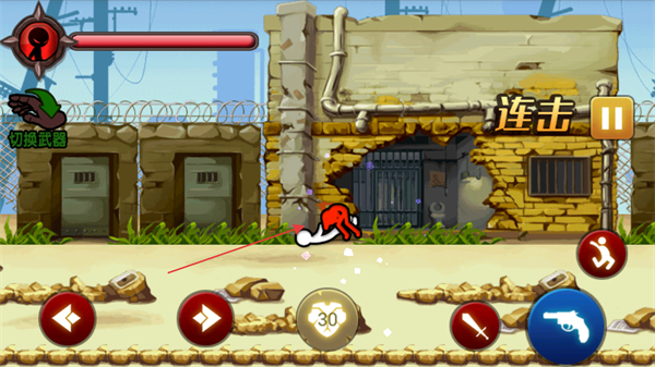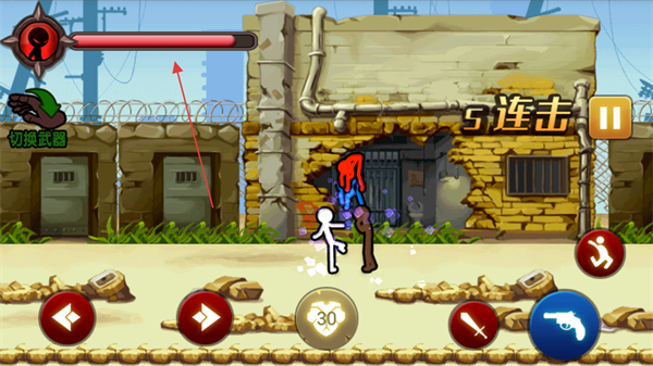 2、点击右侧的剑形或枪形按钮,让火柴人使用武器攻击红色火柴人等敌人,可触发连击,造成大量伤害。