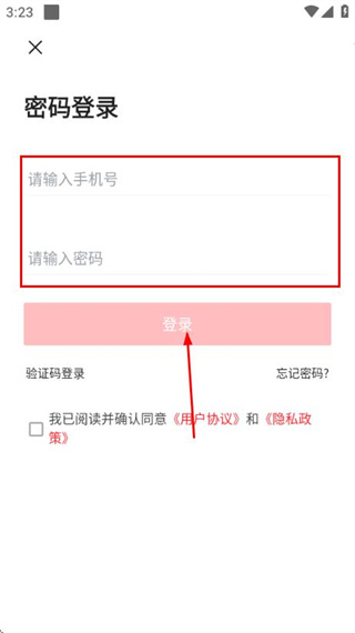 4、在登录页面填写手机号、密码,勾选协议后,点击登录完成账号登录操作。