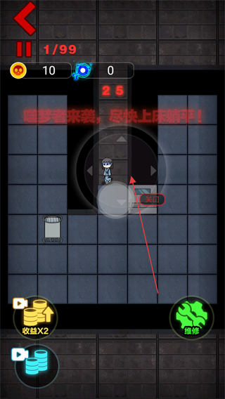 1、进入挑战模式,噬梦者将会在指定时间到来,通过滑动屏幕任意位置控制角色寻找安全的房间。
