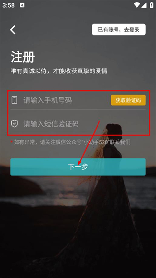 3、在注册页面,输入手机号码验证码后,点击下一步,完成注册流程。