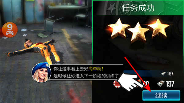 3、关卡成功后,点击继续按钮可进入下一阶段训练,需关注获得的奖励如金币、钻石,后续关卡做好资源积累。