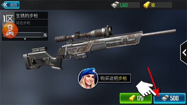4、在武器商店中,点击购买按钮可解锁新枪械如生锈的步枪,结合自身资源和枪械属性,选择适合当前关卡武器。