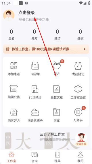 1、打开大家中医app,在工作室页面点击点击登录选项。