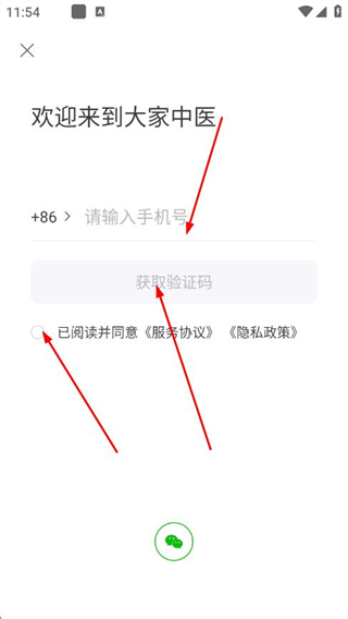 2、进入登录页面后,输入手机号,勾选已阅读并同意协议,点击获取验证码。