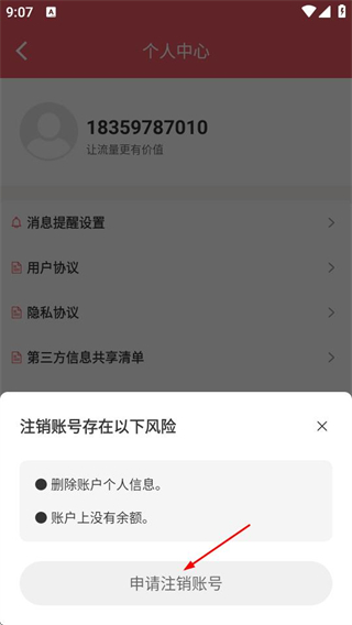 4、在注销账号风险提示框中点击申请注销账号,弹出是否注销提醒。