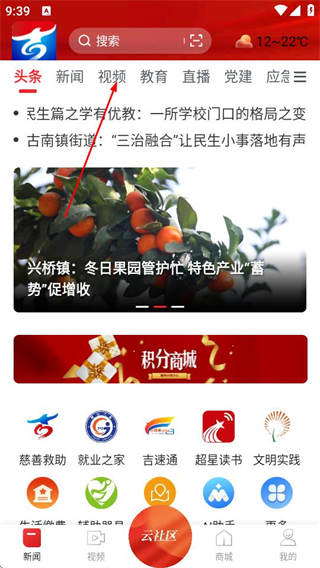 1、在首页顶部导航栏,点击视频标签,进入视频页面。
