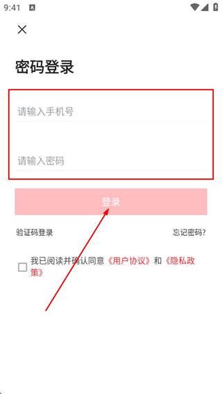 3、在密码登录页面填写手机号、密码,勾选协议后,点击登录完成登录操作。