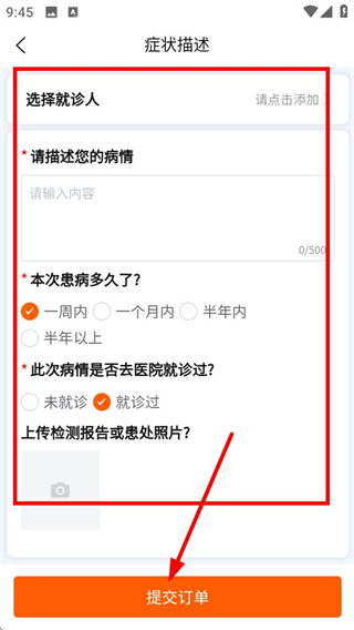 4、在症状描述页面,填写信息后点击提交订单,完成问诊操作。