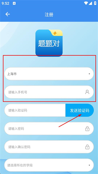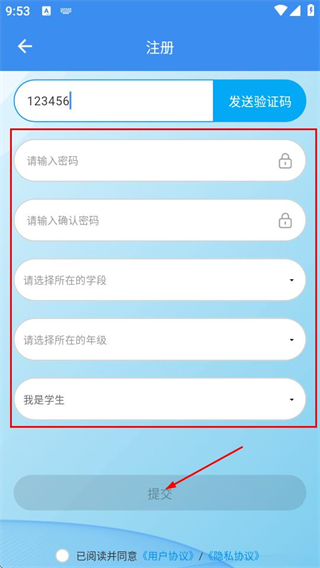 3、在注册页面填写验证码、设置密码、选择学段等信息后,点击提交按钮完成账号注册操作。