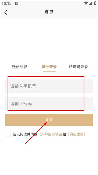 4、在账号登录界面填写手机号、密码,勾选协议后,点击登录完成登录操作。