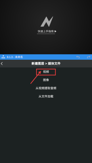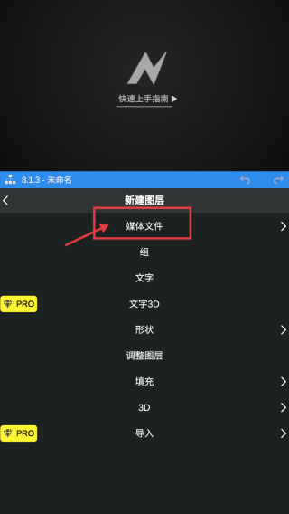 3、在新建图层选项列表中,点击媒体文件选项,进入媒体文件选择环节。