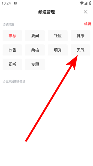 2、在频道管理页面,点击天气频道,进入天气频道。