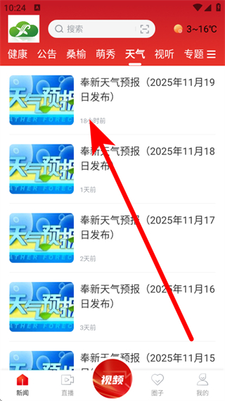 3、在天气频道,点击心仪的天气预报,进入详情页。