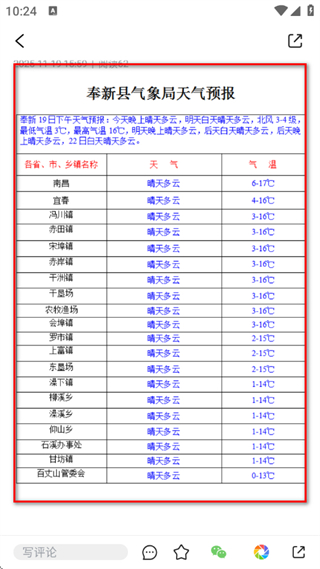 4、在详情页,可查看奉新县各乡镇的天气及气温信息。
