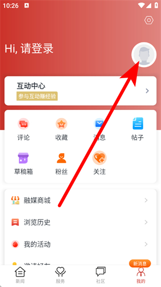 2、在我的页面,点击个人头像区域,进入注册登录页面。