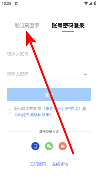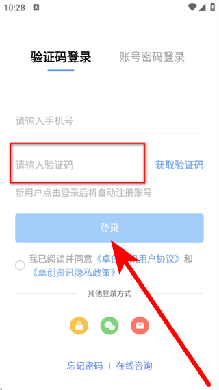 2、在登录页面,点击验证码登录,进入验证码登录页面。