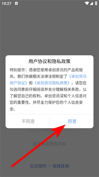 1、打开卓创短讯客户端,在隐私政策弹窗中,点击同意。