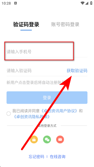 3、在验证码登录页面,输入手机号,点击获取验证码。