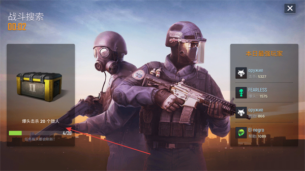 1、参与战斗搜索任务,如爆头击杀20个敌人,完成可获宝箱奖励。
