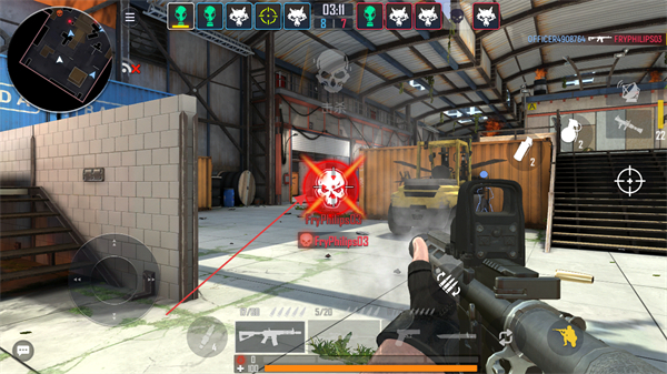 2、在仓库场景中,用虚拟摇杆移动,瞄准敌方角色发起攻击。
