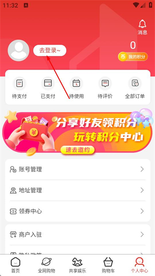 2、在个人中心页面点击去登录按钮,进入同发成商城的登录界面。