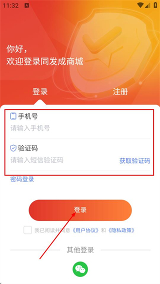 3、在登录界面填写手机号、获取并输入验证码,勾选协议后,点击登录完成账号登录操作。