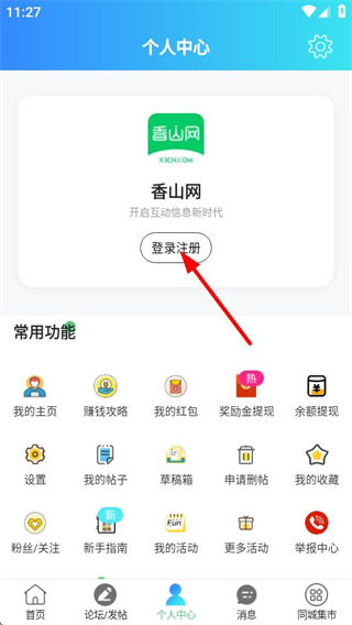 1、在香山网首页,点击底部个人中心选项,进入个人中心页面。