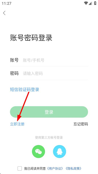 3、在账号密码登录页面,点击立即注册选项,进入输入手机号页面。