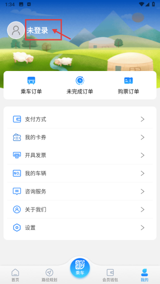 2、在个人中心,点击未登录区域,进入登录/注册选择界面。