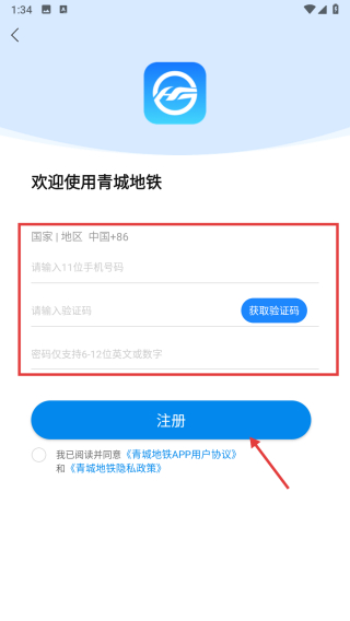 4、输入手机号码、验证码和密码,点击注册按钮,完成账号注册操作。