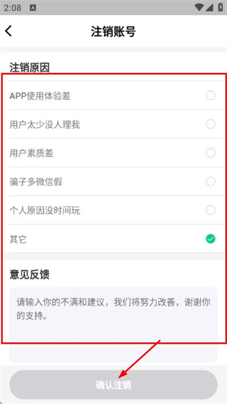 5、在注销账号页面选择注销原因、填写意见反馈后,点击确认注销完成账号注销操作。