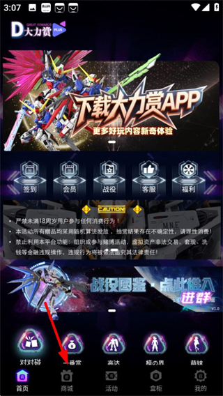 1、在大力赏首页,点击底部商城选项,进入商城页面。