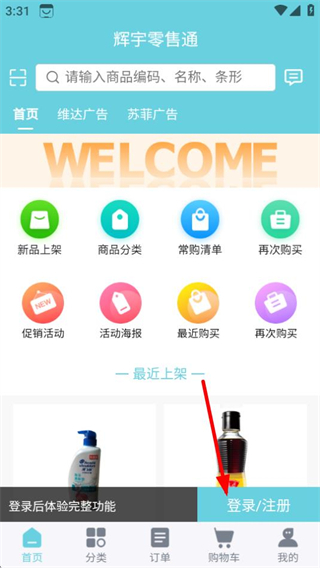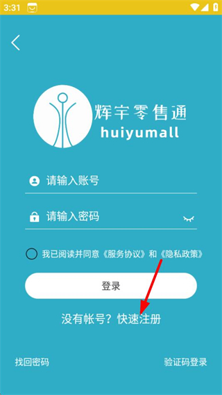1、在辉宇零售通首页,点击登录注册按钮,进入登录页面。