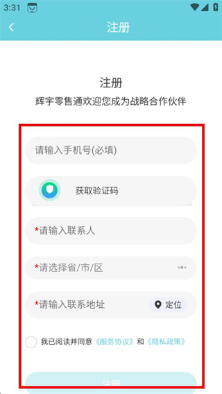3、在注册页面,填写信息,勾选协议后完成注册操作。