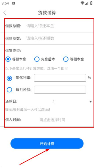 3、在贷款试算页面填写借款信息,选择借贷类型、还款方式后,点击开始计算完成贷款试算操作。