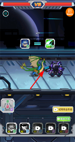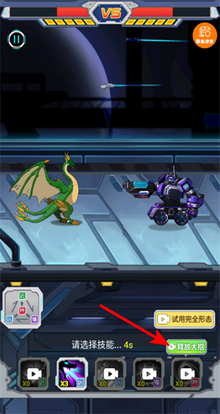 3、在战斗中,我们需要点击下方技能按钮如技能释放大招,增强攻击效果,快速削弱敌方机甲血量,推进战斗进程。